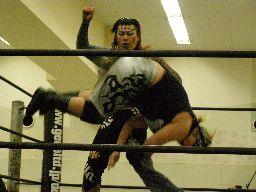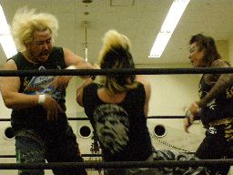 ポイズン2発目のチョークスラムからキャトルミューティレーション(左写真)、雁之助カット。高木が入って雁之助にスタナー。