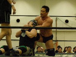雁之助は高木をリングに戻すとドロップキック、ボディスラムからカバー、カウント2。ロープで顔面こすり(右写真)、ウラノを呼び込んでダブルのエルボー。