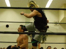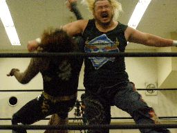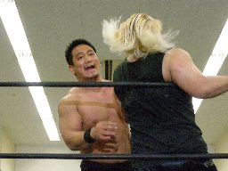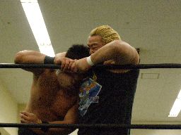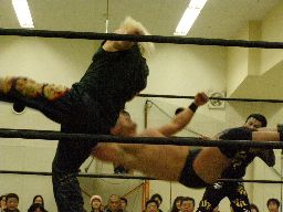ポイズン逆水平、ロープに振ってキチンシンク(左写真)、セントーン、カウント2。高木にタッチ。