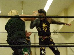 雁之助ファイヤーサンダー狙う、ポイズン着地、振り返った雁之助に呪文、雁之助指をつかんでブレークするとラリアット(右写真)、カウント2。