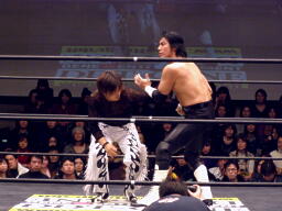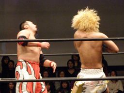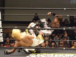 佐々木DDT、トラースキック(左写真)。鳥羽が佐々木にパンチ、カウント2。
