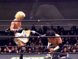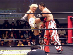 GENTAROは鳥羽の背中にエルボー、パンチ。鳥羽はGENTAROのボディにパンチ(右写真)。GENTAROは鳥羽の顔面をターンバックルにぶつけエルボードロップ、佐々木の足にぶつけて佐々木にタッチ。