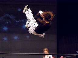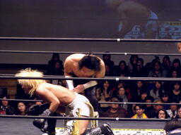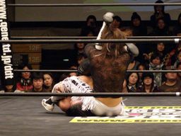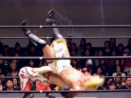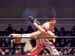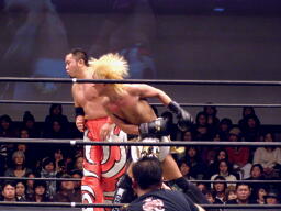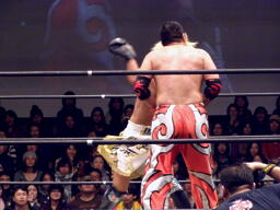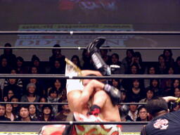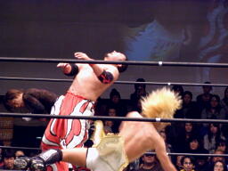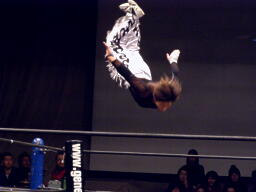 GENTAROボディスラムからコーナーに上ってローリングセントーン(右写真)、カウント2。佐々木にタッチ。