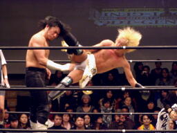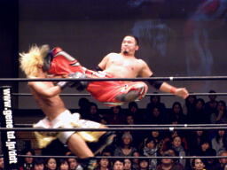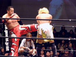 鳥羽ボディ、カカト落とし。いつもならコンボになるのにGENTAROがいちいちダウンするので連打にならない。鳥羽バズソーキック2発(右写真)、カウント2。MIKAMIにタッチ。