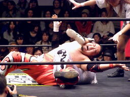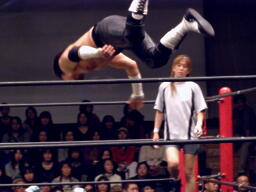 MIKAMIは佐々木にスワンダイブバックエルボー。GENTAROをカニばさみで倒し、その上で佐々木にデュランダル(左写真)。