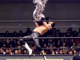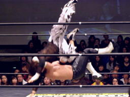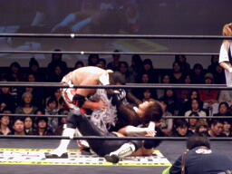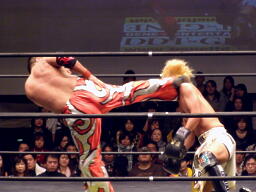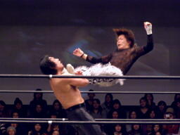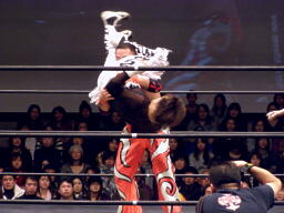 GENTAROフラットライナーの体勢、MIKAMIブロック、GENTAROはMIKAMIを抱え上げると顔面からマットに突き刺す(左写真)。両軍タッチ。