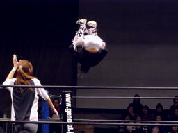 佐々木をコーナーに振ってジャンピングハイキック、コーナーに上ってダイビングセントーン(右写真)。