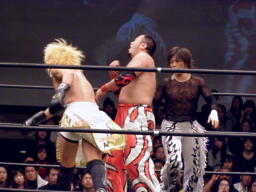 佐々木逆水平(右写真)、コーナーに詰めてさらに逆水平連打。佐々木ブレーンバスター、カウント2。ストンピング。鳥羽ボディにパンチ、佐々木ニーリフト、GENTAROにタッチ。