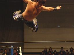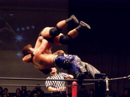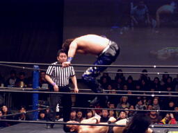HARASHIMAエプロンに出る、いつものスワンダイブボディプレスではなくエルボードロップに(右写真)、カウント2。