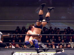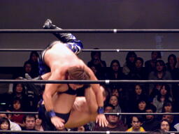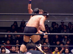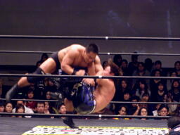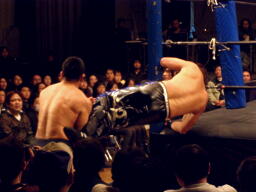 高木パワーボム(左写真)、もちつき式で持ち上げるとコーナーにパワーボムで叩きつける。カバー、カウント2。15分経過。