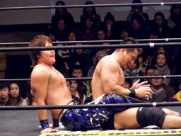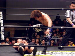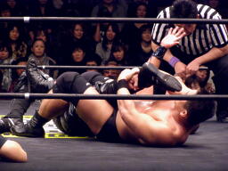 高木はHARASHIMAの足にフットスタンプ、リバースステップオーバーホールドから受身2回(右写真)、カバー、カウント1。