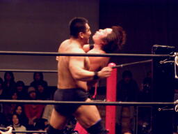 高木が開始早々ラリアットで先制(左写真)。やはり大人気ない。いや、ここはHARASHIMAが先に行くべきだった。高木カバーに行くがカウントは2。
