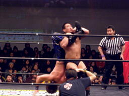 HARASHIMAファイヤーバードスプラッシュ(右写真)、高木2で返すとそのまま持ち上げる。
