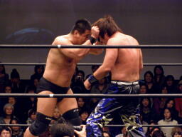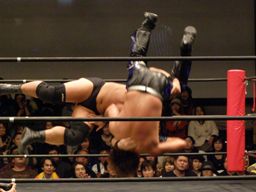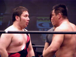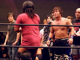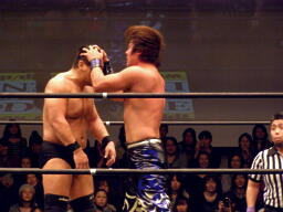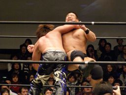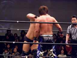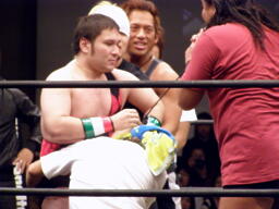 高木肩車、HARASHIMAまたリバースフランケンシュタイナーに行くが高木は直立のままこらえる(右写真)。