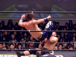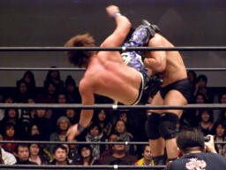 高木肩車、HARASHIMAリバースフランケンシュタイナーに切り返す(右写真)。ダブルノックダウン。