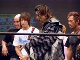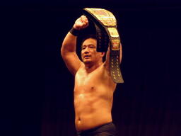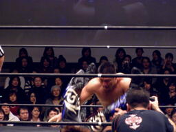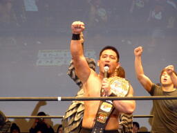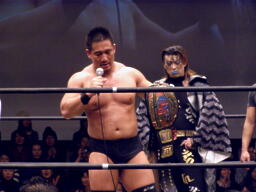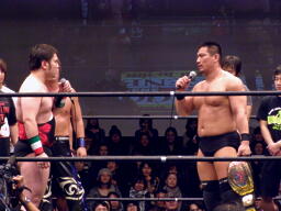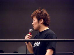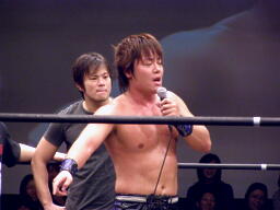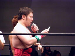 高木「今日はたくさんの御来場、本当にありがとうございました。KO-Dのベルト、強敵でしたが防衛できました。正直、2008年という年は不況だ不景気だと言われ大変な1年でした。社長に就任してから、いや、旗揚げしてから最大の危機を迎えた1年だと思ってます。DDT、マッスル、ユニオン、Cruiser's Game、ハードヒット、新北京、そして歌舞伎町にドロップキックオープンして1年、今年は中野にミツボシカレーをオープンさせました。普通に考えたらおかしな話です。それだけこの2008年はどうしようもない苦しい1年でした。でも皆さんのおかげで何とか1年迎えることができました。ありがとう!ただですね、本当に苦しい1年でしたよ、本当にね。」(右写真)