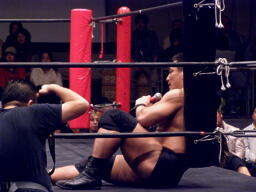 ポイズン張り手、高木ダウン。「みんなお前についてきたんじゃないか!三四郎!立て!」(左写真)