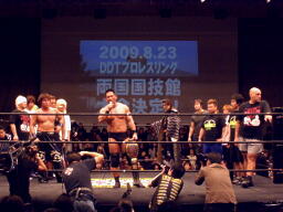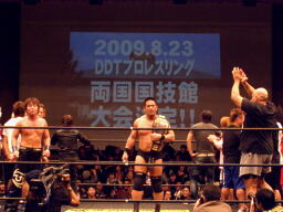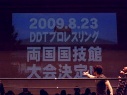 スクリーンには両国国技館の写真をバックに「2009.8.23 DDTプロレスリング両国国技館大会決定!!」の文字が。