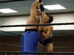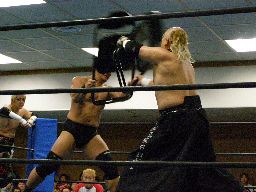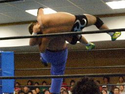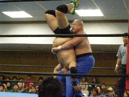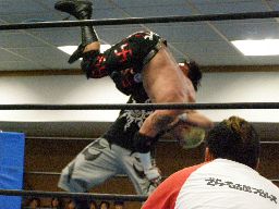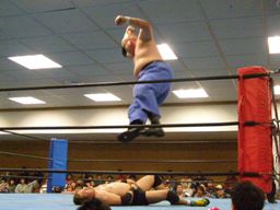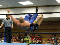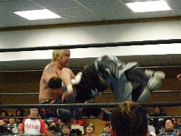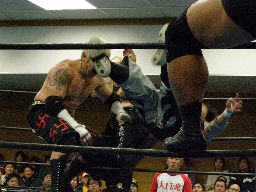 小林ロープに飛ぶ、マンモスカウンターのドロップキック(右写真)。マンモスはチョークスラムからフライングソーセージ、カウント2。