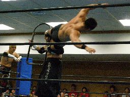 葛西コーナーに振る、笠木切り返して串刺しニーアタック、さらにソバット、ドロップキック(左写真)。笠木ロープに飛ぶ、エプロンから沼澤がキック。葛西は沼澤にタッチ。