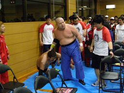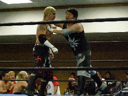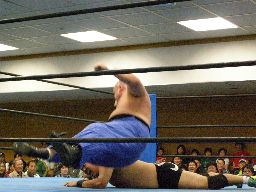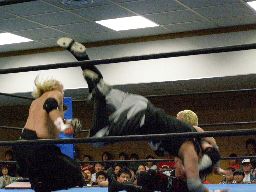 小林ロープに振ってドロップキック(右写真)、場外に出す。また客席に投げ込んでイス攻撃。場外で張り手合戦。5分経過。