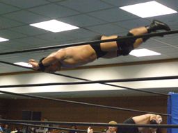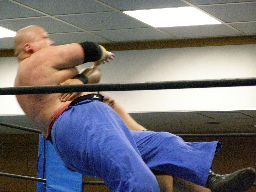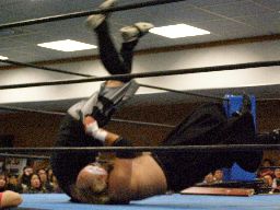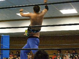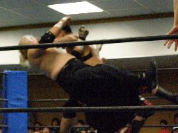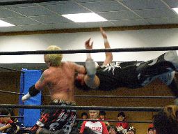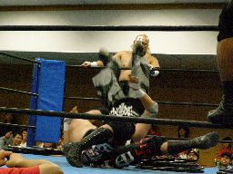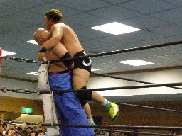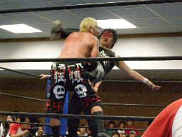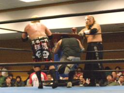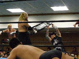 沼澤がイスを並べてコーナーに上る、高木が足を押さえる。笠木コーナーに上りイス目掛けて雪崩式ブレーンバスター(右写真)、高木がサンダーファイヤーパワーボムで続く。