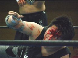 沼澤笠木をリングに戻しさらにノコギリ。笠木大流血(左写真)。沼澤ヘッドバット、エルボースタッブ。笠木もヘッドバット打ち返すが沼澤はサミング、葛西にタッチ。