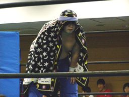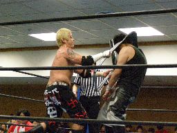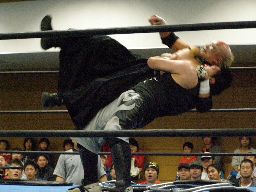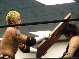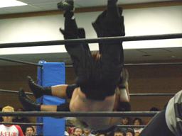 葛西机にDDT、コーナーにセットした机の破片に頭からぶつける(左写真)。沼澤にタッチ。