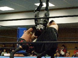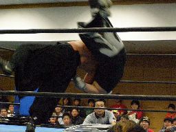 045邪猿気違'Sは合体サドンインパクト(右写真)、高木カット。葛西が高木を場外に出し客席にブレーンバスター狙う、高木切り返して逆に葛西を客席目掛けてブレーンバスター。