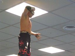葛西ロープに飛ぶ、笠木延髄蹴り(左写真)。