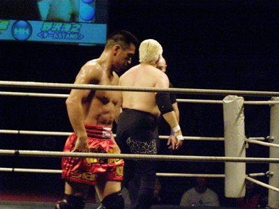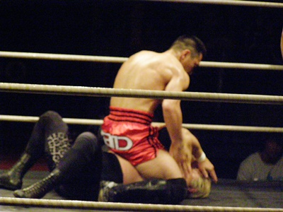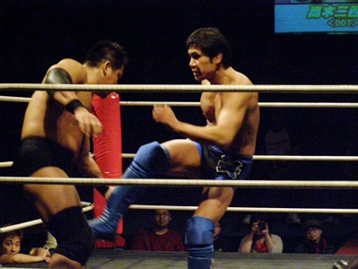 ローキック(右写真)、ハイキック、後藤ダウン。後藤ロストポイント4、あと1回のダウンまたはエスケープで後藤はTKO負け。
