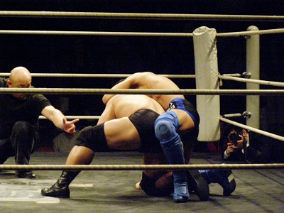 高木もう一発パワーボム(左写真)、冨宅ダウン。冨宅ロストポイント1。カウントは8。