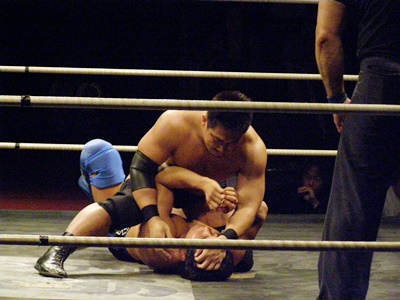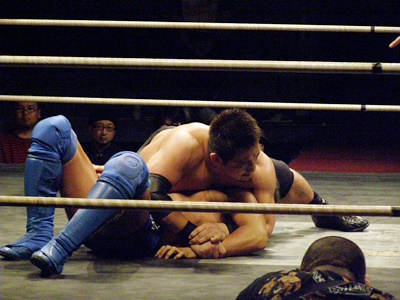 冨宅脱出するとニーオンザベリーの体勢からパンチ打ち下ろす。アームロック狙いから十字、さらにヒザも固める(右写真)、高木ロープ。高木ロストポイント1。