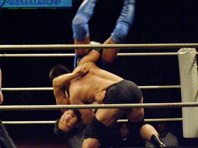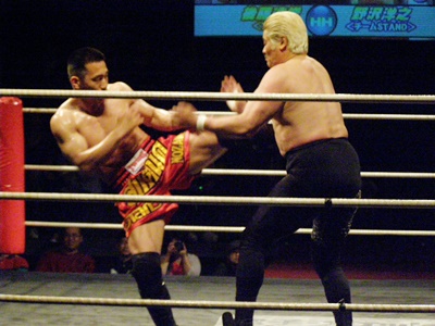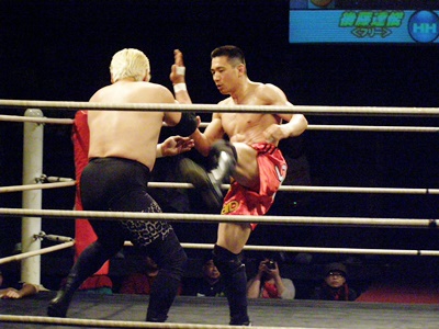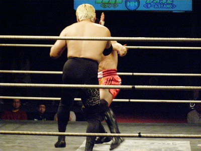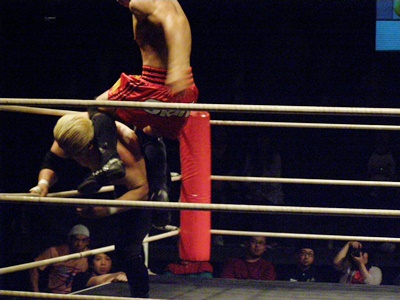 ロープ際で飛びヒザ蹴り(右写真)、後藤は場外転落。
