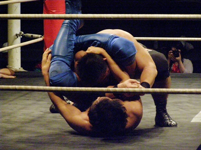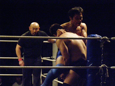野沢マウント掌底(左写真)から十字、後藤あっさりとロープ。後藤ロストポイント1。