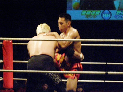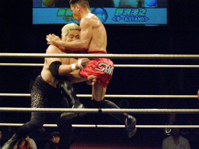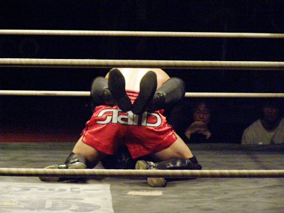 高木組み付く(右写真)、首の取り合い。冨宅はヒザ蹴り、ローキック。高木は体を沈めてヒザ十字に、冨宅ブロック。
