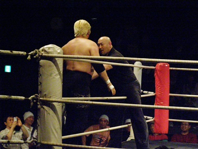 後藤はリング下からイスを取り出す。セコンドの大家が止めようとするが後藤は大家をイスで一撃(左写真)、大家退場。