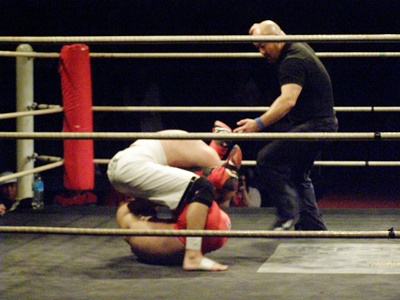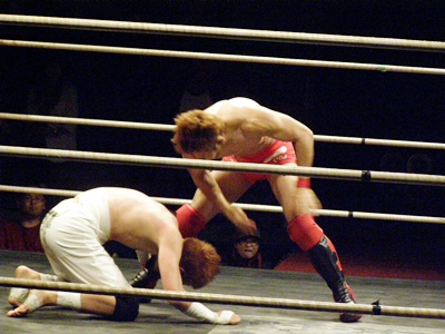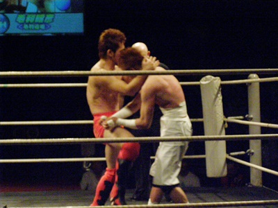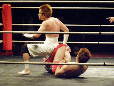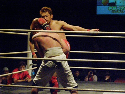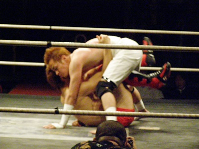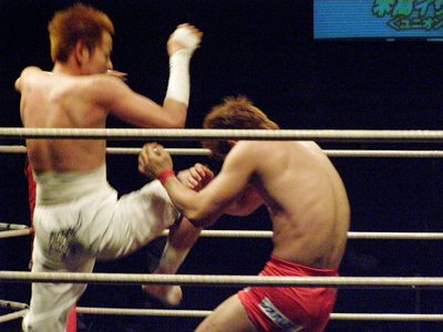 イサミは前田タックルに行くが毛利はブロックして上から掌底打ち下ろす(右写真)。イサミダウン。イサミロストポイント1。イサミカウント8で立つ。