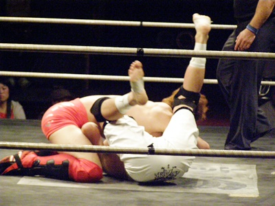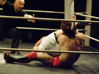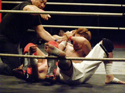 イサミが逆に十字決める、毛利ロープ。毛利ロストポイント3。5分経過。
