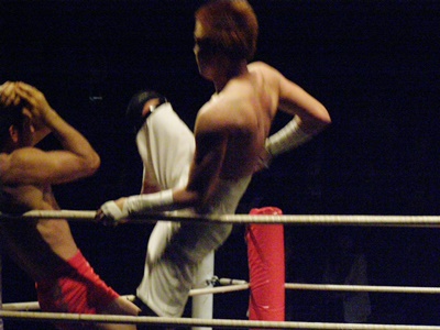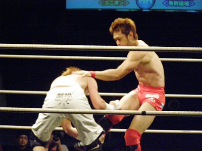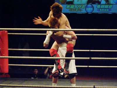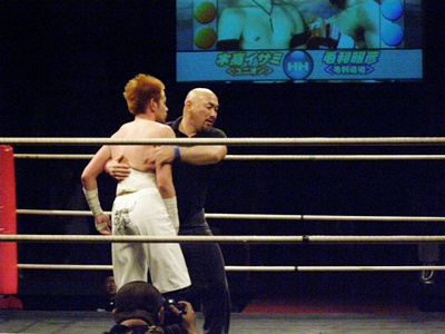 両者立ち上がる、イサミはコーナーに詰めると飛びヒザ蹴り(右写真)、毛利ダウン。毛利ロストポイント2。毛利カウント8で立つ。