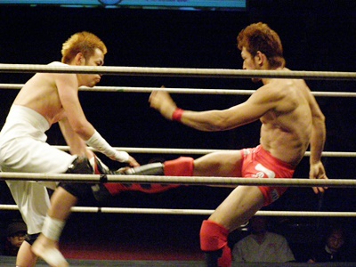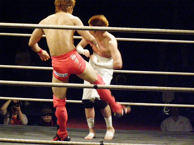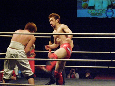 毛利ハイキック連打(左写真)、イサミダウン。