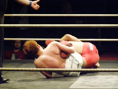 イサミタックル、毛利が上になってサイドマウント(左写真)からアームロック。イサミが上になる。