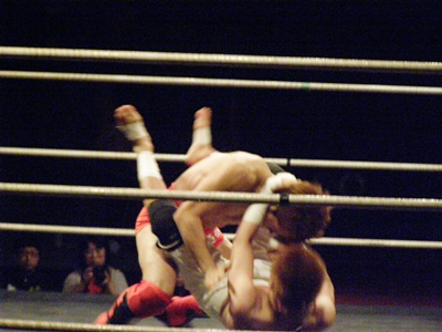 イサミ前転してタックル、毛利を倒す(右写真)。