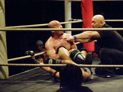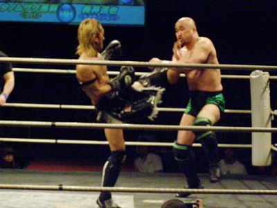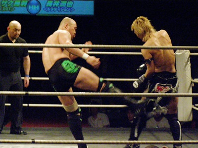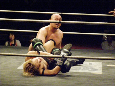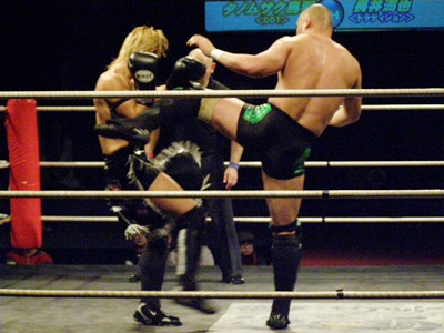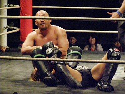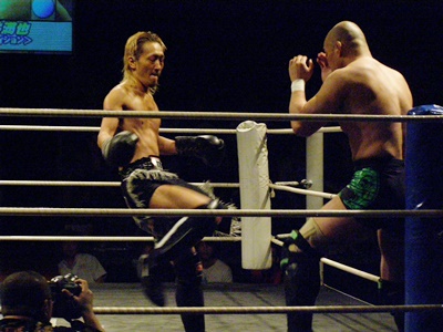 追撃のハイキックで長井ダウン(左写真)。長井ロストポイント1。
