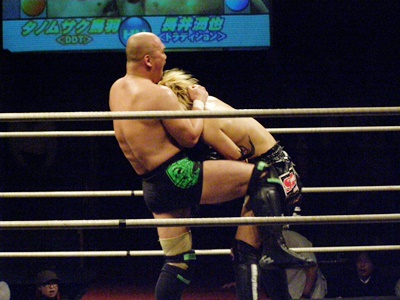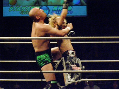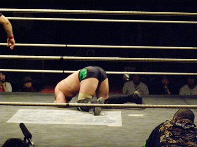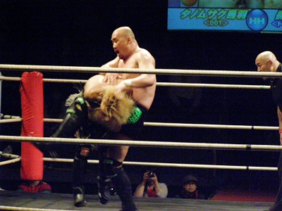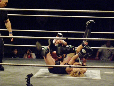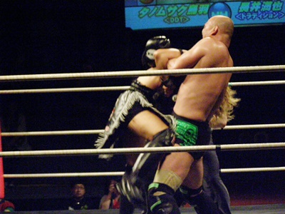 グラウンドに持ち込んでスリーパー(右写真)、鳥羽脱出。10分経過。