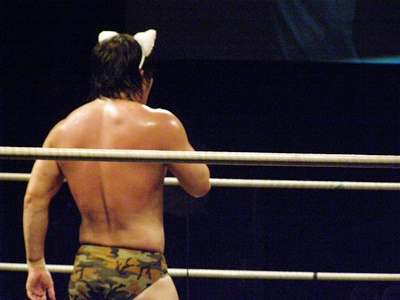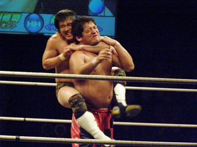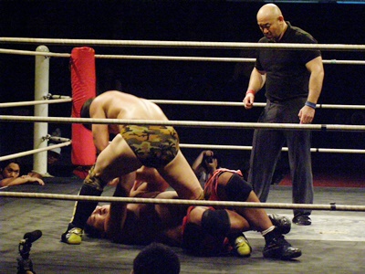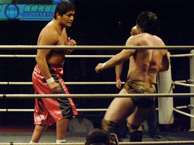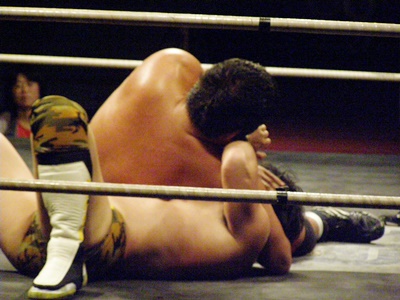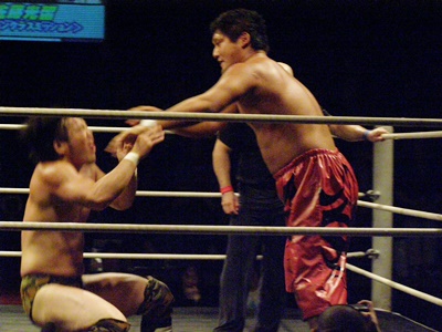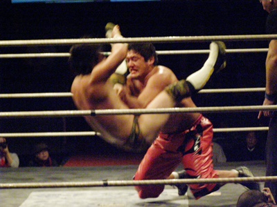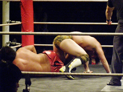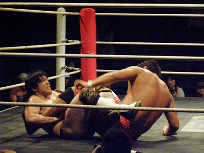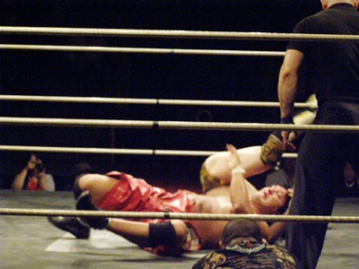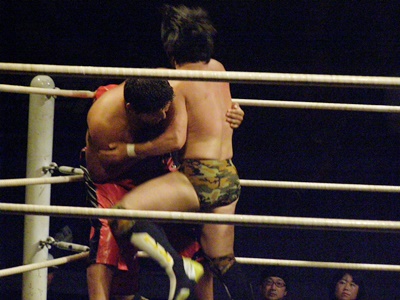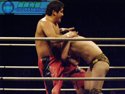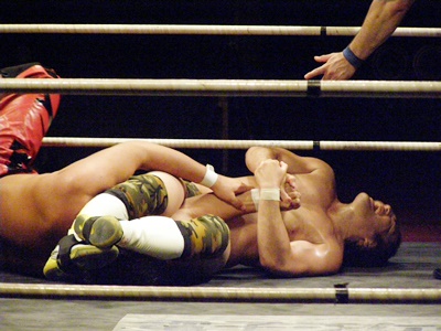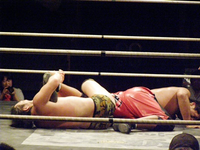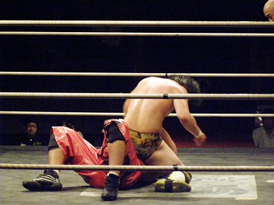 ランニングニーリフト、佐藤ダウン(右写真)。佐藤ロストポイント2。カウント9で立つ。