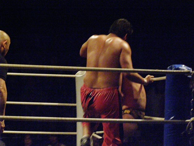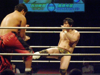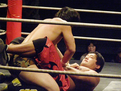 石川コーナーに詰める、佐藤体勢を入れ替えてヒザ蹴り(右写真)、しかし膠着とみなした和田レフェリーがブレークを命じる。