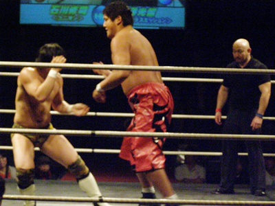 石川ヒザ蹴り(左写真)、張り手。