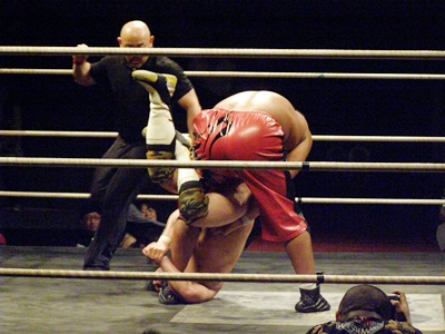 佐藤は胴タックルで持ち上げると落としてマウントに。上から掌底連打(左写真)。