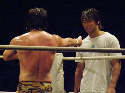 飯伏もそれを無言で装着(左写真)。何そのコミュニケーション?